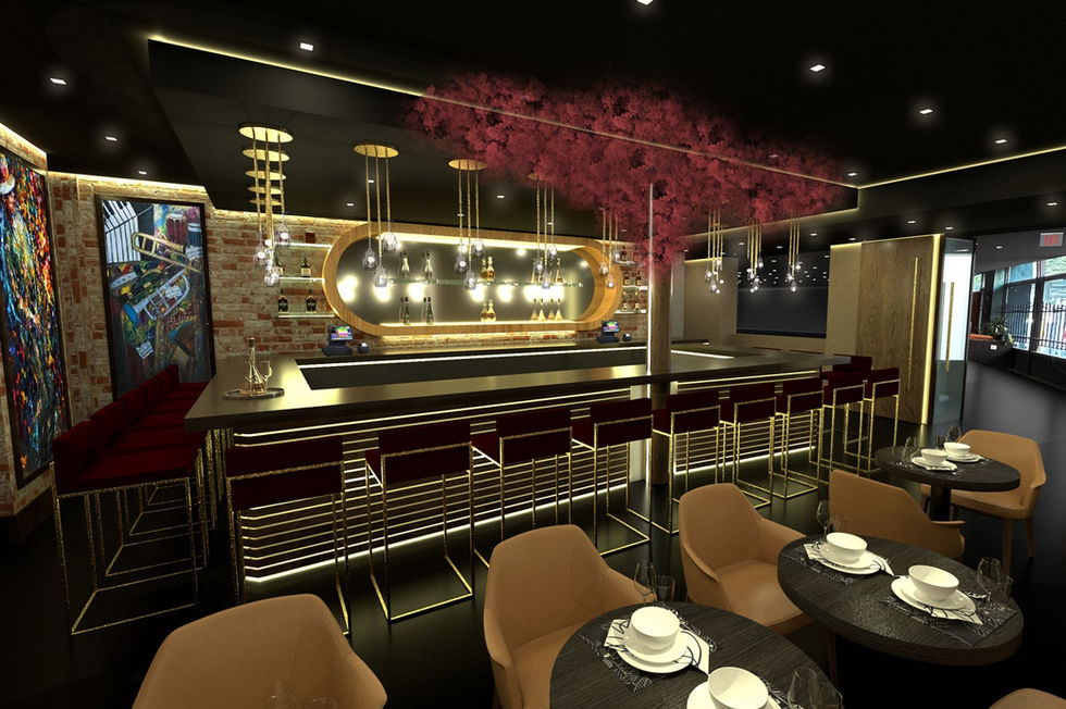 New bar design that is integrated with the existing column elegantly while increasing guest seating and space efficiency that caters to professional networking events. We proposed sophisticated materials that exude elegance and luxury with hints of brass accents for added glamour. The bar design is both functional and visually appealing with an angular countertop to invoke interest. To create an elegant ambiance, we opted for a mix of ambient, task, and accent lighting. The pendant lights stand out as statement pieces while linear LED lighting highlight architectural features of the overall space.
